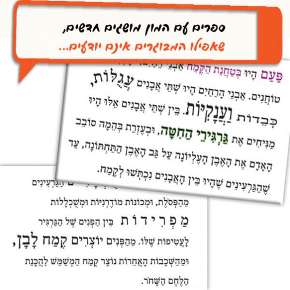 משפטי הספר מסודרים בצורה מיוחדת, הם עולים ויורדים, מתעקלים ומתעגלים, הכול לפי הענין.